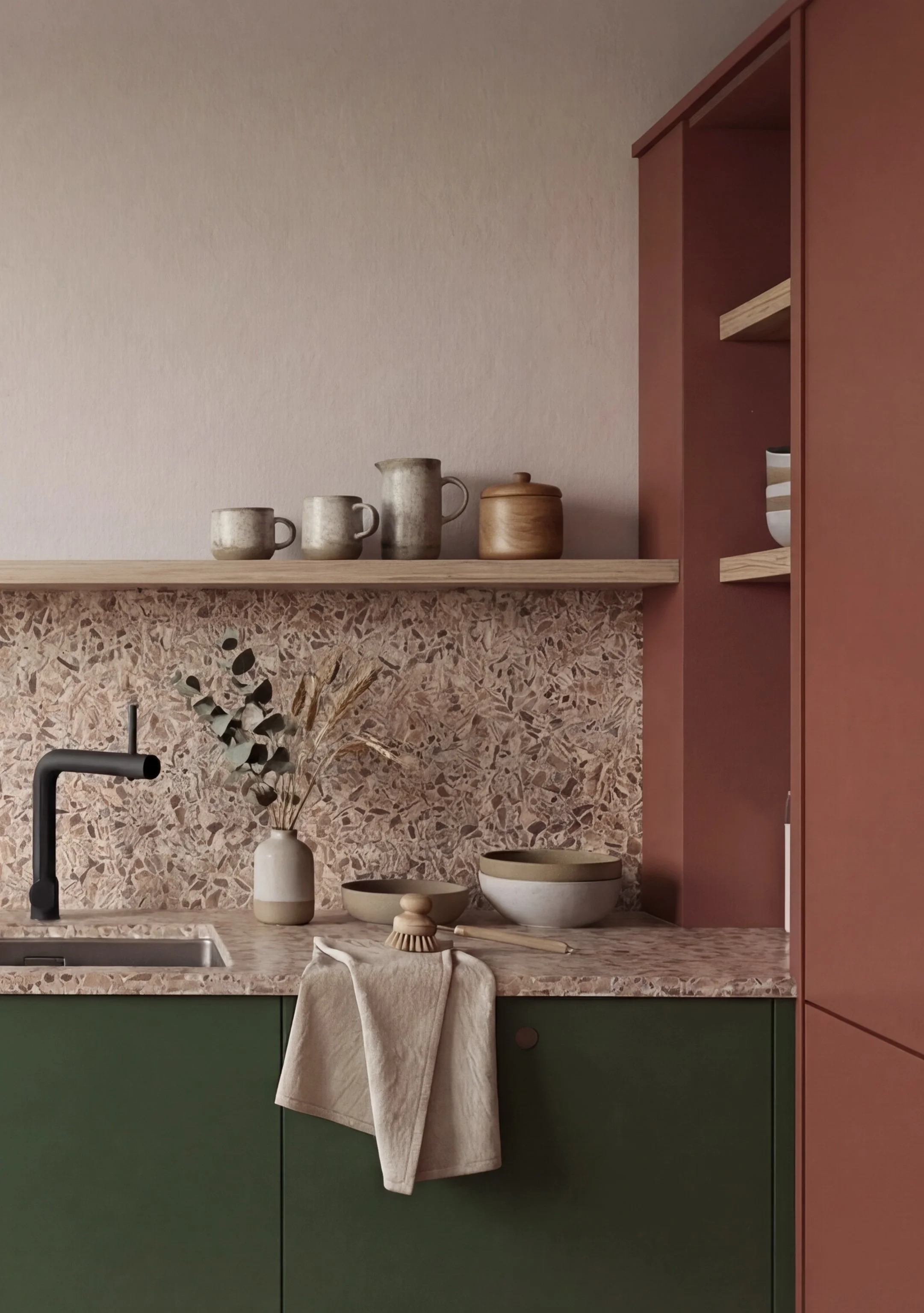The secret is not to fight against that softness, but to embrace it. Earthy tones often feel especially at home here. Muted greens, clay, terracotta and chalky neutrals can sit beautifully in cooler light, creating a kitchen that feels settled, grounded and gently warming.